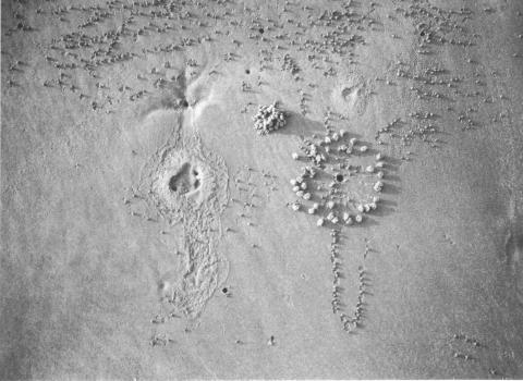 Frequently I was working in and around a day's worth of human, canine and bicycle tracks.    Which raises a delicate issue:    should I "restore" a sandpainting by removing said tracks (via photoshop)? -- or should I simply smile as nature shows us yet another way of "renewing the canvas"?