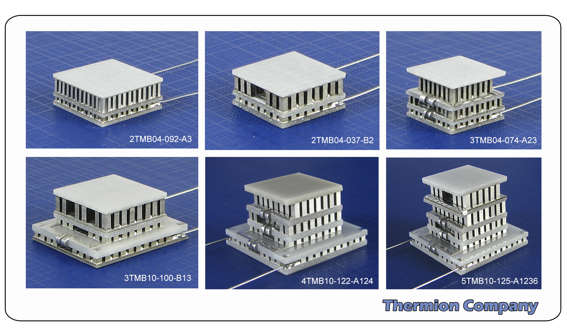 This Thermion series is designed specially for cooling CCDs, multi-element matrixes of IR detectors, focal plain arrays and other planar optoelectronic elements which have relatively large surface and require low temperatures for their operation. Over 250 cascade configurations having identical or near identical top and bottom dimensions are available now. Despite the increased cold side area, these coolers provide an even greater temperature drop than traditional "pyramidal" cascade TECs. This Thermion’s series is permanently supplemented with new advanced configurations in response to the most refined customer’s needs. Such are the TECs: 2TMB04-042-C2, 2TMB04-066-A2, 2TMB04-092-A3, 5TMB06-113-A1224, 5TMB10-164-B2224, 5TMB10-183-A1123 and many others.