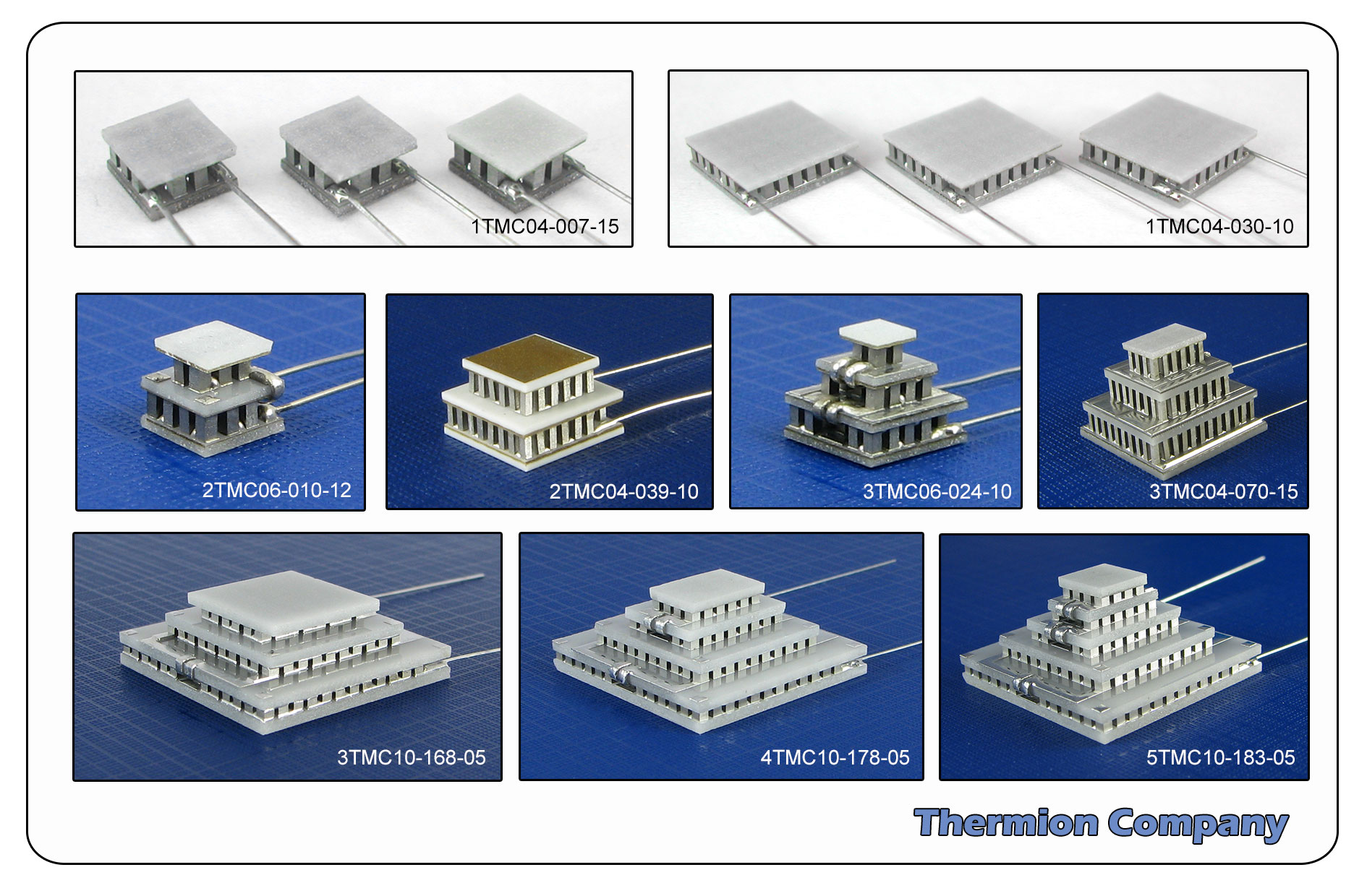 The TMC series is a line of miniature conventionally configured thermoelectric heat pumps in modular form designed for photonic and electronic applications. The series includes 3 sub-series (single and multi stage): TMC04, TMC06 and TMC10. Each sub-series is fabricated in several versions with TE leg lengths in the range from 0.3 to 2 mm. In such a way a great variety of TECs, covering wide range of temperature differences and heat-pumping capacities, is provided. The multi-stage coolers of this series have a specific “pyramidal” shape, making them ideal for spot cooling of miniature optoelectronic components such as semiconductor lasers, light-emitting diodes, detectors and other localized heat sources. Due to the use of high efficient TE materials, these TECs ensure temperature differences several degrees greater as compared with the best analogous designs available at the market.